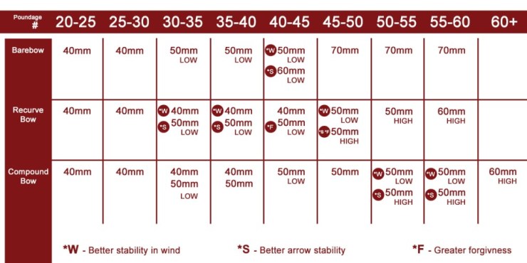 Elas são resistentes em condições de vento e funcionam melhor com peso de puxada de 35-45 libras para tiro com arco recreativo e até 50 libras para competição.