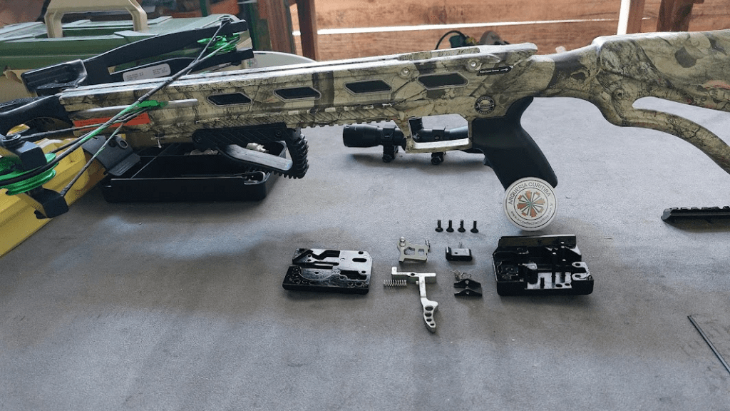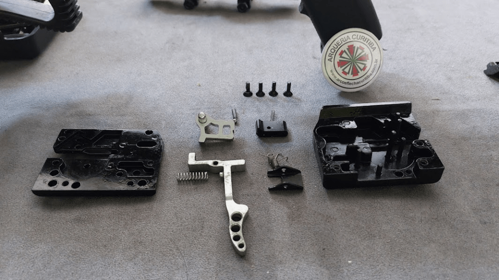 Recebemos na semana passada a balestra para manutenção que foi comprada em 2017 em nossa loja. O defeito constatado foi o excesso de óleo lubrificante no sistema de gatilho, pois o cliente buscando fazer a manutenção pecou por inserir em demasia o lubrificante que em conjunto com a poeira acumulada criou um tipo de “calço hidráulico” no mecanismo e emperrou a trava de segurança “anti dry fire” e impedia que a flecha entrasse na conexão do sistema e por consequência o disparo não ocorria.